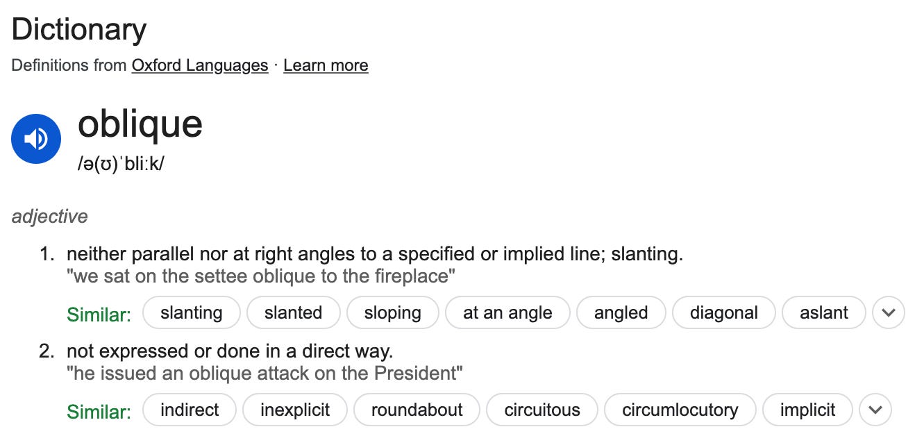 The borrowed from the French word “oblique” takes on a new meaning in English:
